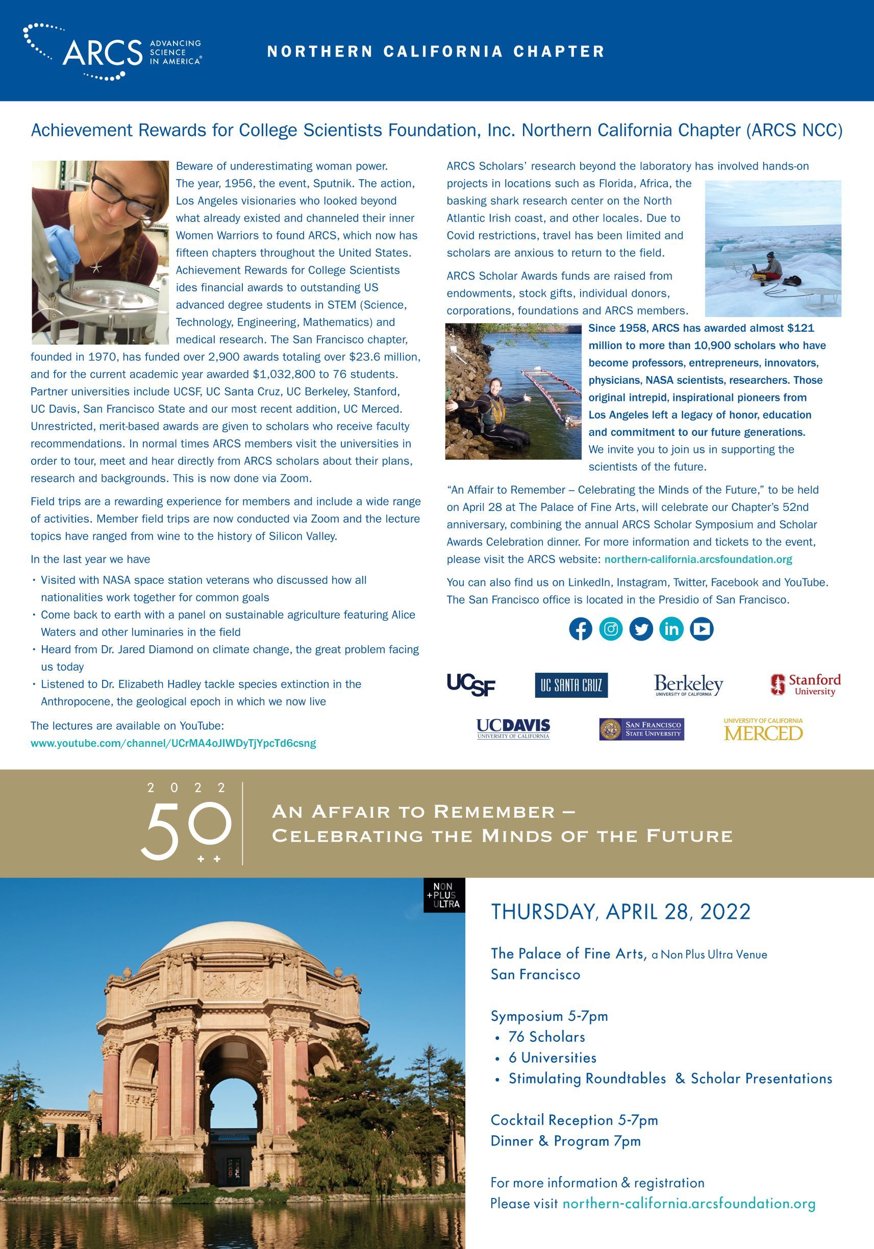 Since 1970, the Northern California Chapter has funded more than 2,900 Scholar Awards totaling over $23.6M. For the academic year 2021-22 the Chapter provided over $1m to 76 ARCS Scholars at six universities in Northern California (San Francisco State University, Stanford University, UC Berkeley, UC Davis, UC San Francisco, and UC Santa Cruz). Our latest university partner, UC Merced, will have ARCS Scholars in the 2022-23 academic year.