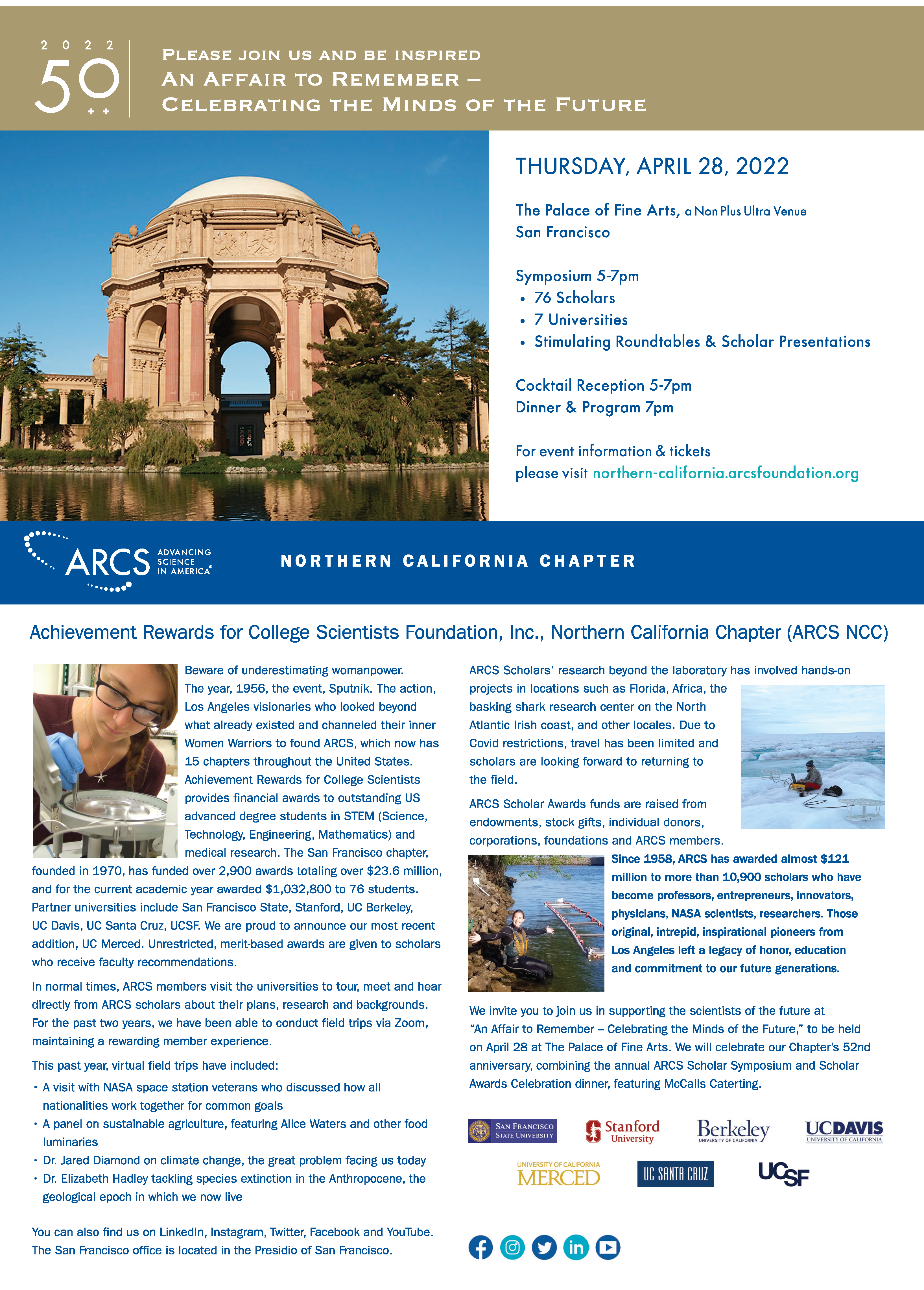 In an iconic San Francisco venue, the Palace of Fine Arts, the Northern California Chapter of ARCS Foundation will be combining its annual Symposium and Scholar Awards Celebration into a commemorative experience as we move into our 52nd year. Attendees can look forward to engaging with over 75 scholars from...