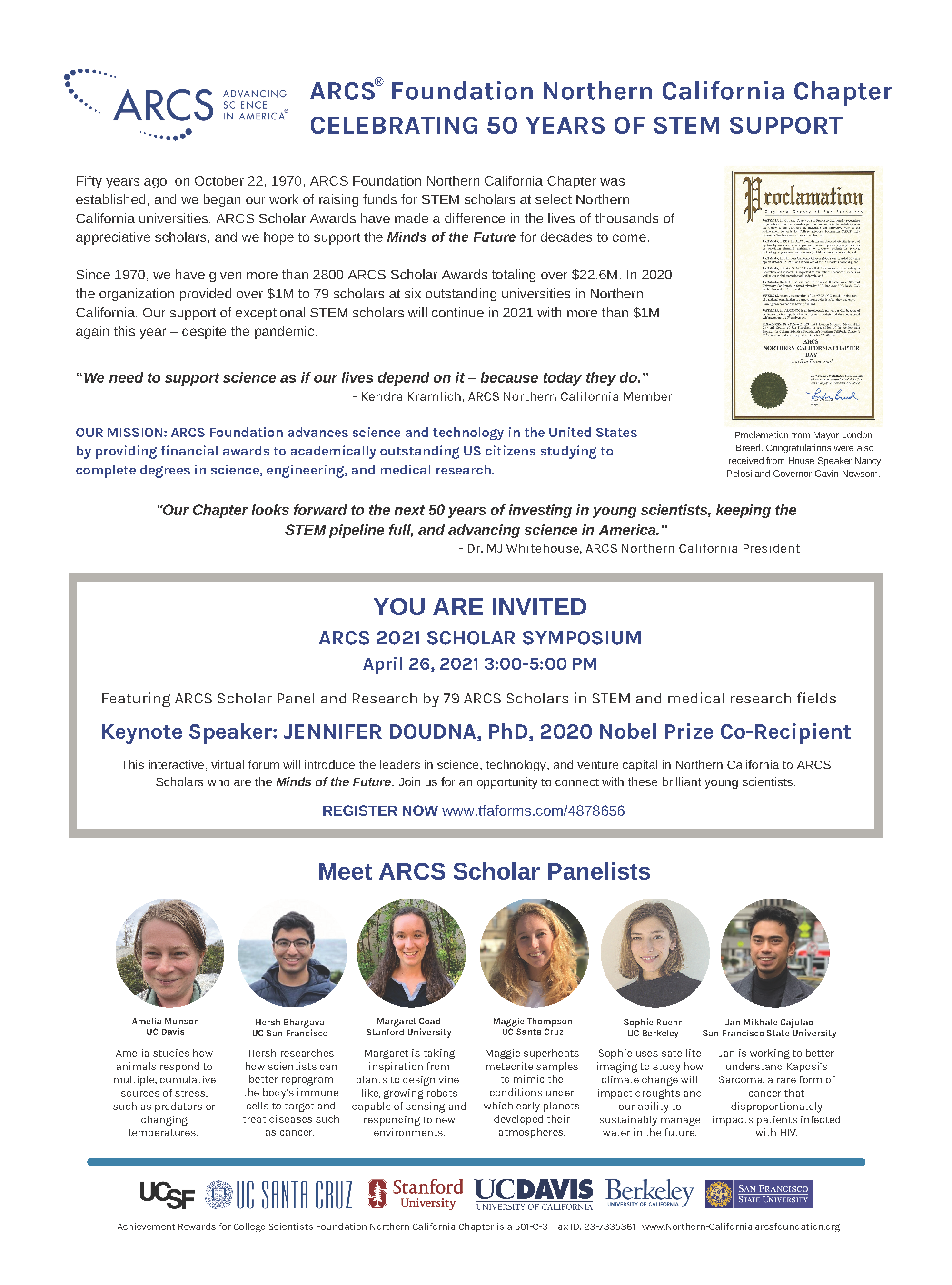 ARCS Northern California Chapter is delighted to have a prominent ad in the “Anniversaries” edition of the San Francisco Business Times/Silicon Valley Business Journal, published on February 5, 2021. In addition to acknowledging and celebrating our 50th anniversary, the ad and its accompanying photo gallery aim to publicize ARCS and its mission to the Bay Area business and tech community. Our upcoming Symposium and its ARCS Scholar speakers are featured, along with a registration link which we hope will elicit many clicks!