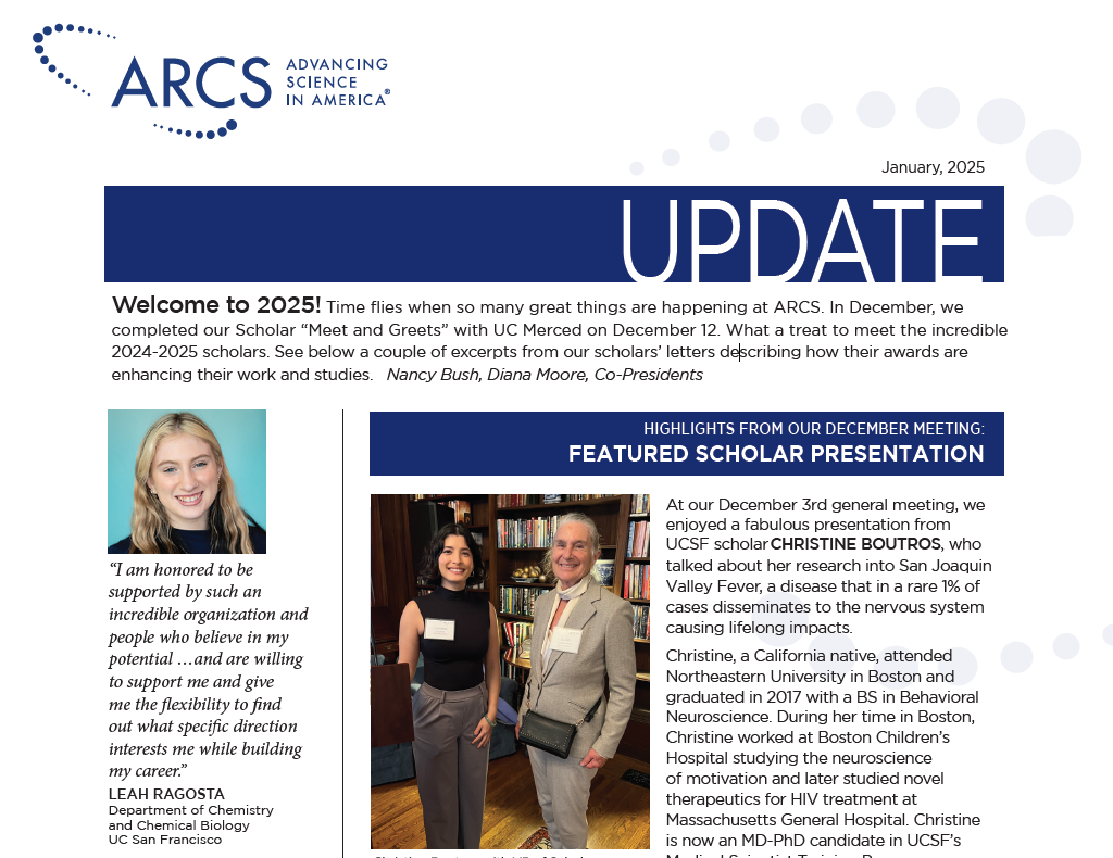 The ARCS Northern California Chapter January 2025 newsletter is now available! This month's publication features highlights from the December 2024 meeting, NCC ARCS Sparks nominees, and important upcoming dates.